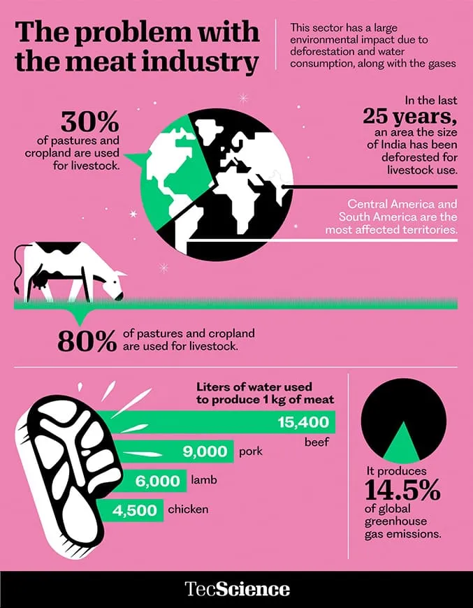 A meat-based food system requires an enormous amount of energy, land, and water resources. Figures from the Food and Agriculture Organization (FAO) of the United Nations indicate that the industry is responsible for generating almost 15% of the world’s greenhouse gas emissions. This also involves high-impact water consumption and is one of the major causes of deforestation due to the expansion of pastures for livestock use.