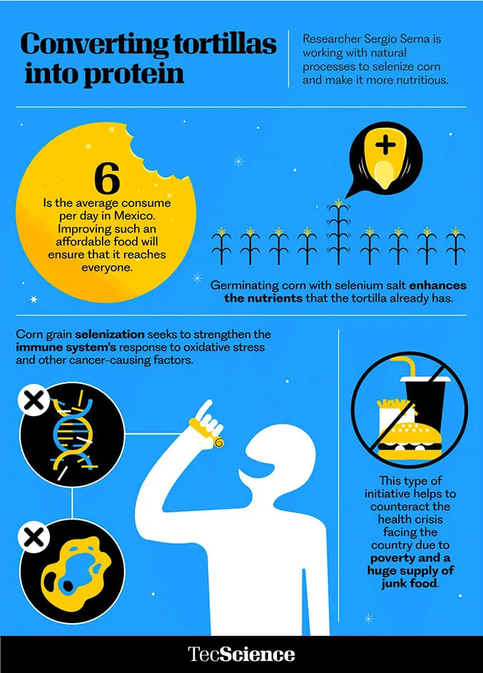 The average Mexican consumes about six tortillas a day. Serna says that converting such a basic food into a new-generation protein not only ensures that it will be accessible to all but also helps prevent diseases such as diabetes, hypertension, and other disorders such as hypercholesterolemia, a defect that makes the body unable to eliminate bad cholesterol.