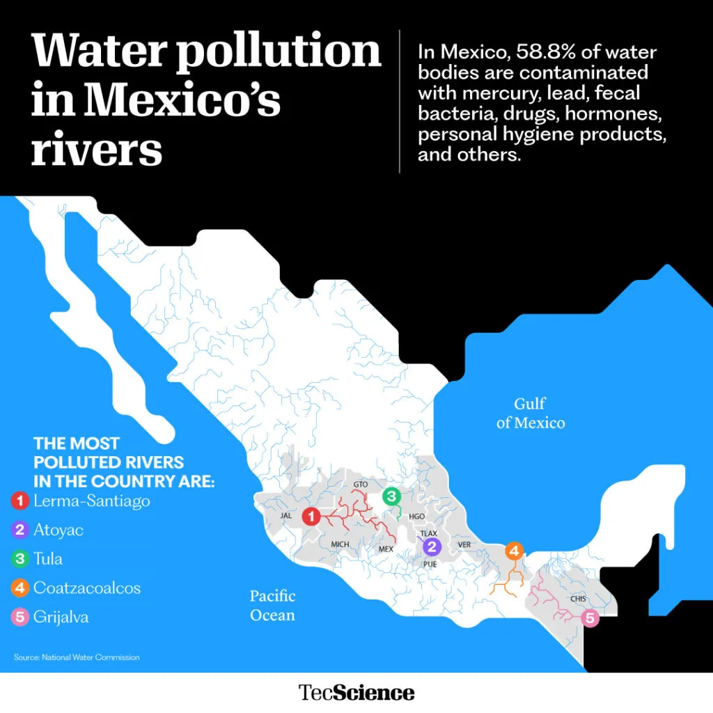 Pollution plagues many of the country’s rivers, as industrial and household waste is routinely dumped into them. Some of the most affected are the Lerma Santiago, Atoyac, and Tula rivers. Yet, determining exactly how many others contain harmful compounds remains a challenge.
