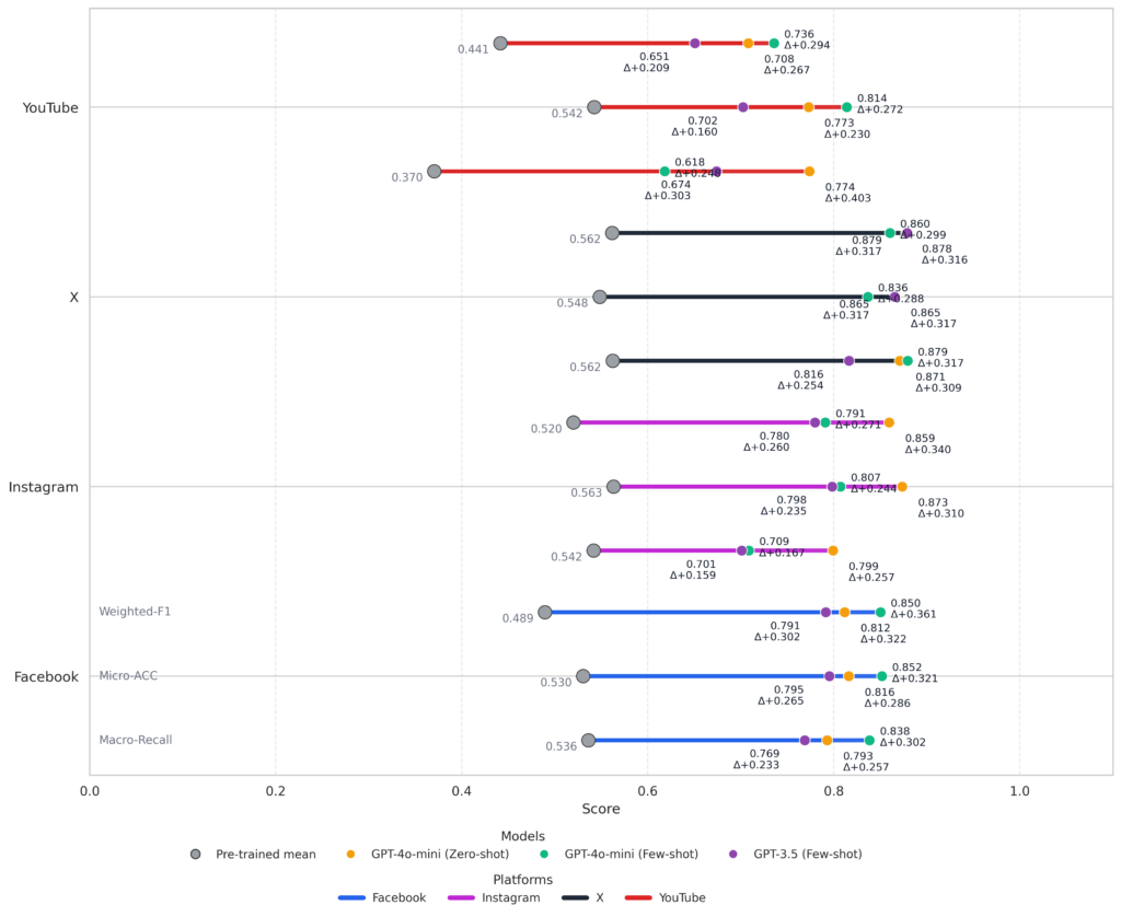 GPT-4o-mini, particularly under the few-shot approach, achieved accuracy levels above 80 percent on Facebook and Instagram, while maintaining highly competitive results on more challenging platforms such as X, where irony, confrontation, and emotionally charged brevity are common.