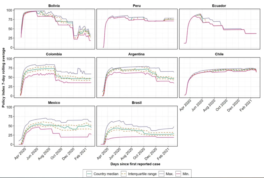 Mexico faced similar fragmentation, with states like Mexico City imposing stricter restrictions while others adopted minimal policies. (Knaul et al., 2022). In contrast, countries like Chile and Peru adopted more centralized and stringent approaches, with national governments enforcing uniform measures across the country (Burki, 2020).