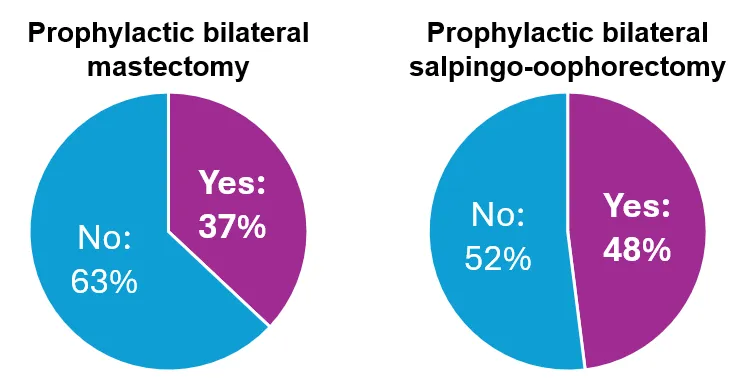 Depending on the type of mutation, 37% of candidates underwent preventive bilateral mastectomy, and 48% had preventive surgery on their fallopian tubes and ovaries.