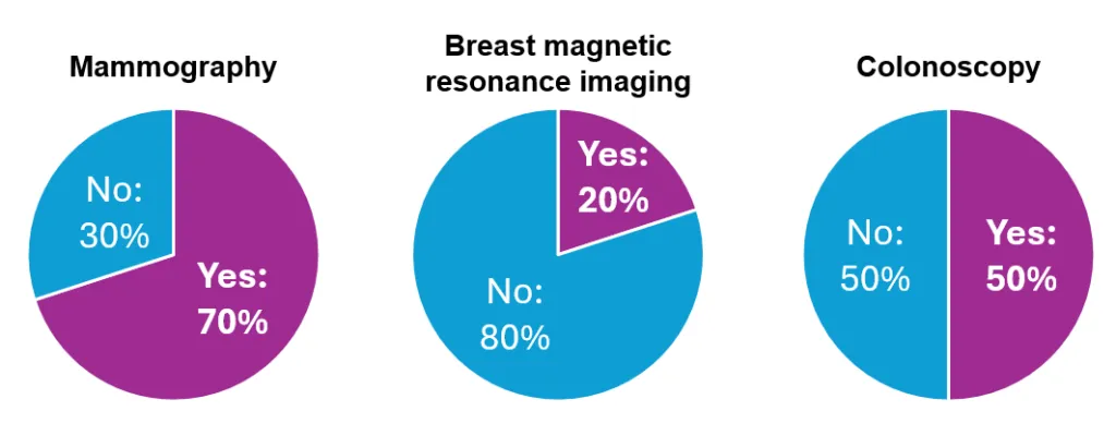 Regarding monitoring studies, 70% of participants had an annual mammogram in the past year, and 20% had a breast MRI in the previous year—additionally, 50% of those who were recommended to have a colonoscopy followed through with the procedure.
