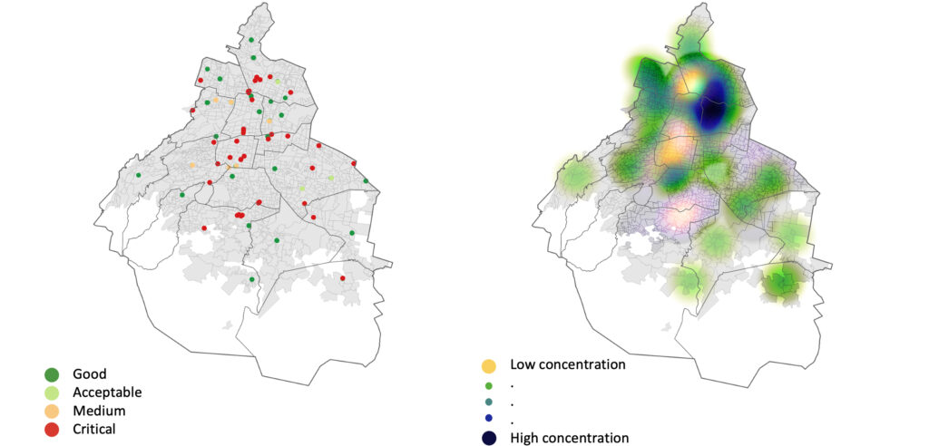 To verify this observation, researchers created density maps using the centroid—the geographic center—of daily active COVID-19 cases by neighborhood in Mexico City. The geospatial analysis reveals clear territorial segregation in areas with the highest concentration of cases.