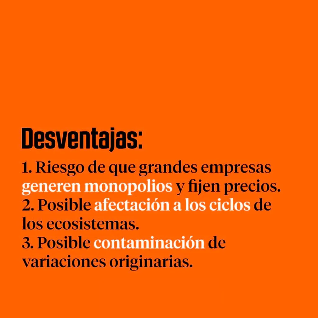 Reconoce en esta tecnología el riesgo de que grandes empresas, que son prácticamente monopolios, acaparen el mercado de semillas transgénicas e impongan sus precios, como ya ocurre con las variedades híbridas.