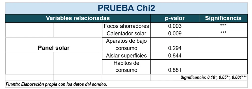 Se estimó la independencia estadística entre la acción de instalar un panel solar respecto a otras acciones que favorecieran la reducción en el consumo de energía en la vivienda.