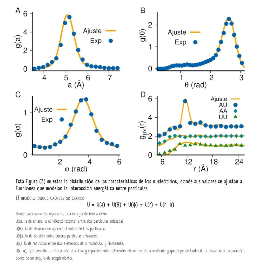 Es entonces cuando se calculan las funciones de distribución de estos nucleótidos, o la probabilidad de encontrarlos en una conformación o acomodo geométrico específico.