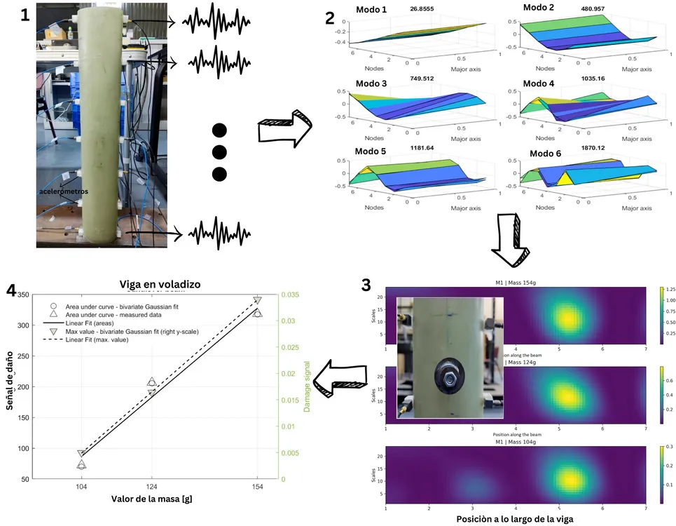 También se utiliza la técnica Transformada Continua de Wavelet (CWT) que funciona como un microscopio matemático que “amplifica” las señales relacionadas con daños, permitiendo detectar irregularidades que podrían ser invisibles en análisis tradicionales.