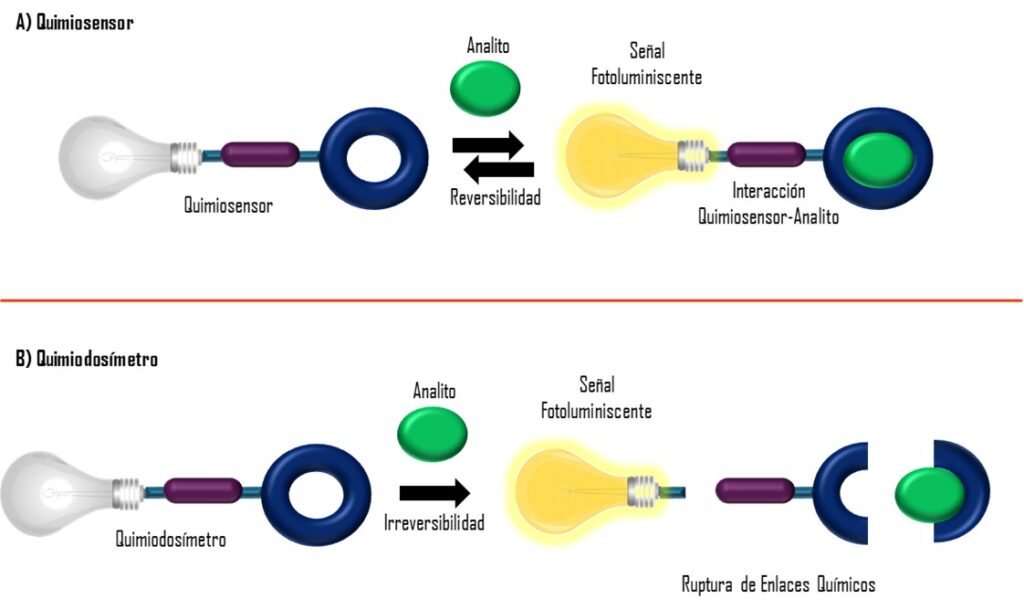 Estos dispositivos utilizan sensores moleculares (llamados quimiosensores y quimiodosímetros) que son sustancias sintéticas capaces de reaccionar ante otro compuesto químico, como un contaminante o una biomolécula. Al ocurrir esta reacción, el sensor experimenta un cambio en sus propiedades fisicoquímicas.