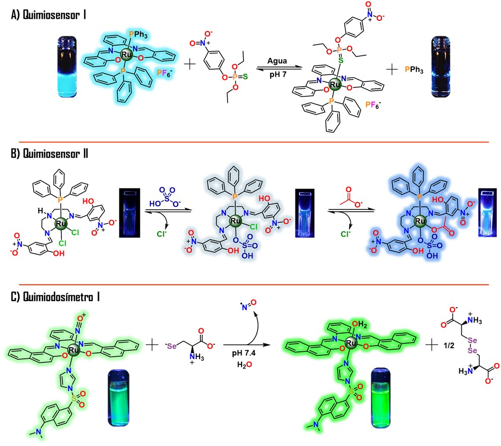 Los sensores fotoluminiscentes de Ru2+ y Ru3+ presentan intensas bandas de absorción y emisión de luz visible, son muy hidroestables y fotoestables, lo que los convierte en buenos candidatos para detectar sustancias en agua.