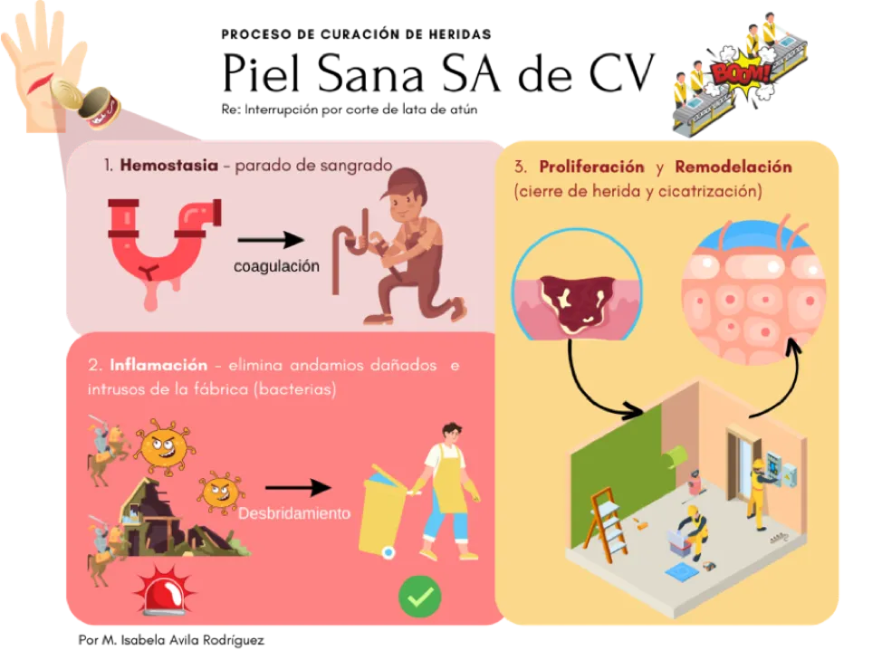 Finalmente, la fábrica Piel Sana SA de CV reinicia sus actividades, y grupos celulares como fibroblastos y queratinocitos se encargan de generar nuevos andamios y construir nuevas rutas para cerrar la herida y que todo vuelva a funcionar adecuadamente.[3]