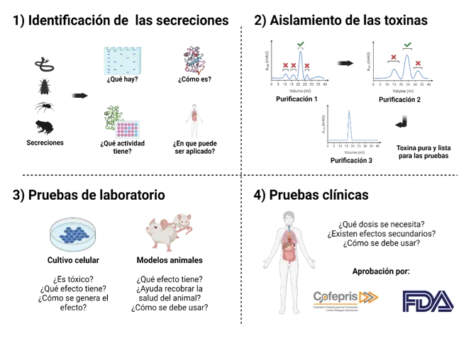 Actualmente, múltiples formulaciones con toxinas como principio activo se venden como medicamentos o están en el proceso de investigación para llegar a serlo. El camino para convertir una toxina en un medicamento requiere múltiples estudios que permitan identificar, aislar y mostrar la eficiencia de los potenciales principios activos, así como demostrar que los compuestos y formulaciones bioactivas no generan efectos secundarios indeseados (Figura 2).