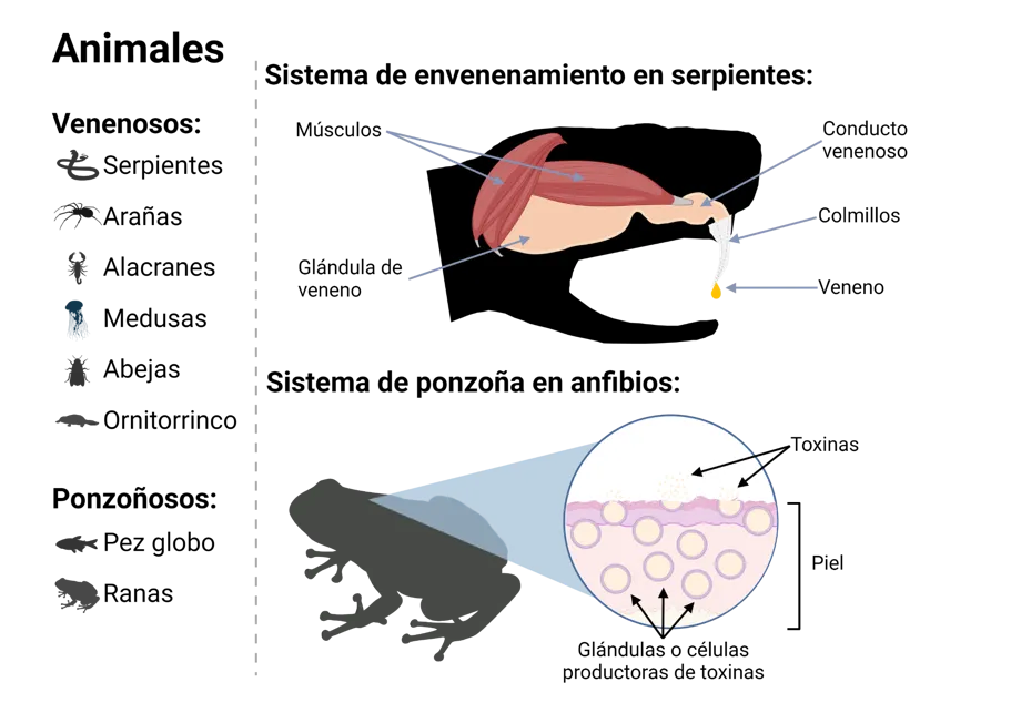 Desde la antigüedad, los animales han sido parte clave de la sociedad, siendo partícipes en nuestra alimentación, cultura, religión y medicina. En particular, los animales venenosos y ponzoñosos (ver Glosario) (Figura 1) han generado temor a lo largo de la historia humana. Sin embargo, estos mismos animales también han sido fuente de inspiración para desarrollar tratamientos y medicamentos que previenen la muerte de millones de personas anualmente.
