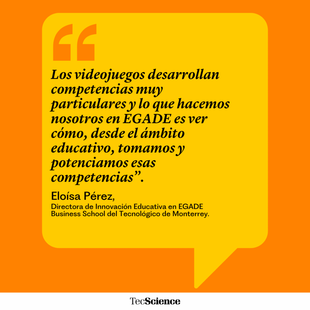 Eloísa Pérez, directora de Innovación Educativa en EGADE Business School del Tecnológico de Monterrey, platica que el equipo analizó diferentes videojuegos para identificar comportamientos que los estudiantes podían trasladar a la vida real y en dinámicas académicas.