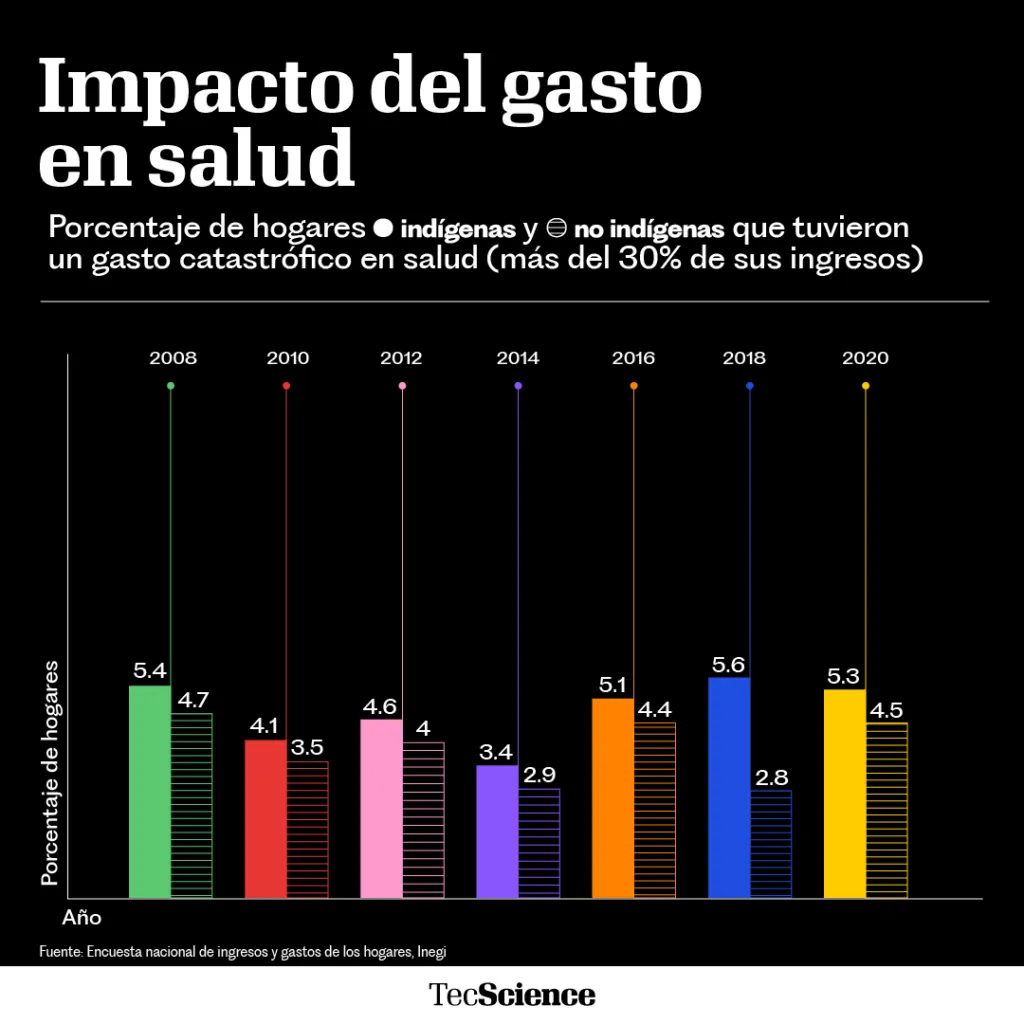 “Encontramos que, en todo momento, existe una desigualdad al compararlas”, explica Meneses. “Los hogares indígenas siempre incurren en un mayor gasto catastrófico, gasto empobrecedor y gasto excesivo en salud”.