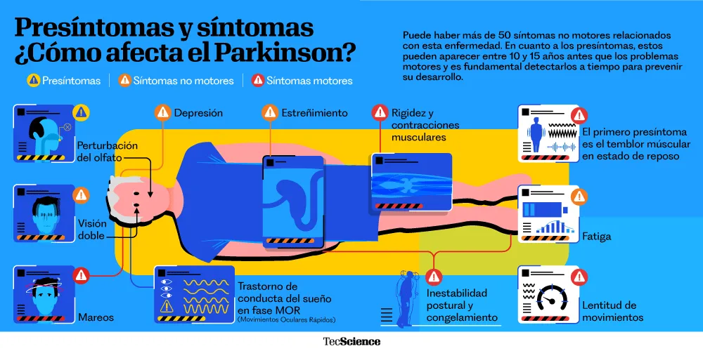 Si bien este desorden neurológico luce una gran variedad de datos clínicos en su exposición clínica, la manifestación inicial suele comenzar con el temblor de reposo, “que primero se da en una extremidad y después se generaliza en todo el cuerpo”, matiza el neurocientífico. Las personas afectadas sufren, además, rigidez de músculos de miembros, lentitud de movimientos, inestabilidad postural y congelamiento.